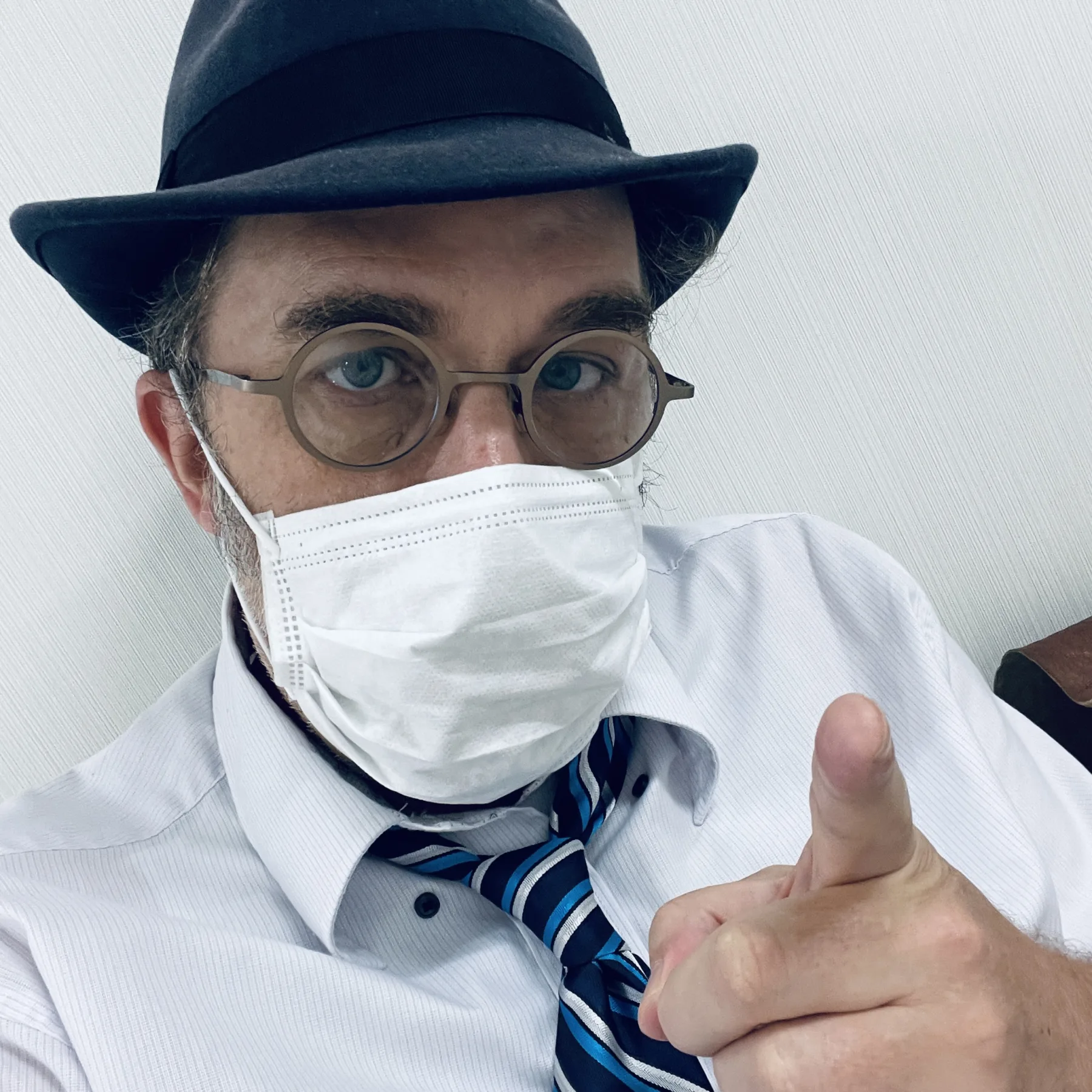 10:22 / Outfit: Blue Stetson-brand felt fedora, short sleeve shirt (handy for injections), shoulder bag from Kathmandu (note: give it some saddle soap, 7 years old already!), cheap & cheerful & (importantly) soft headphones, & yes Margaret, a mask.