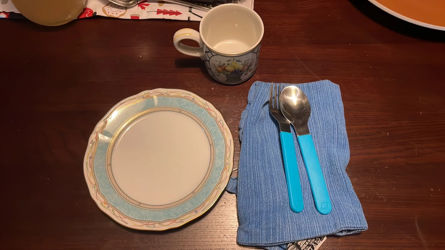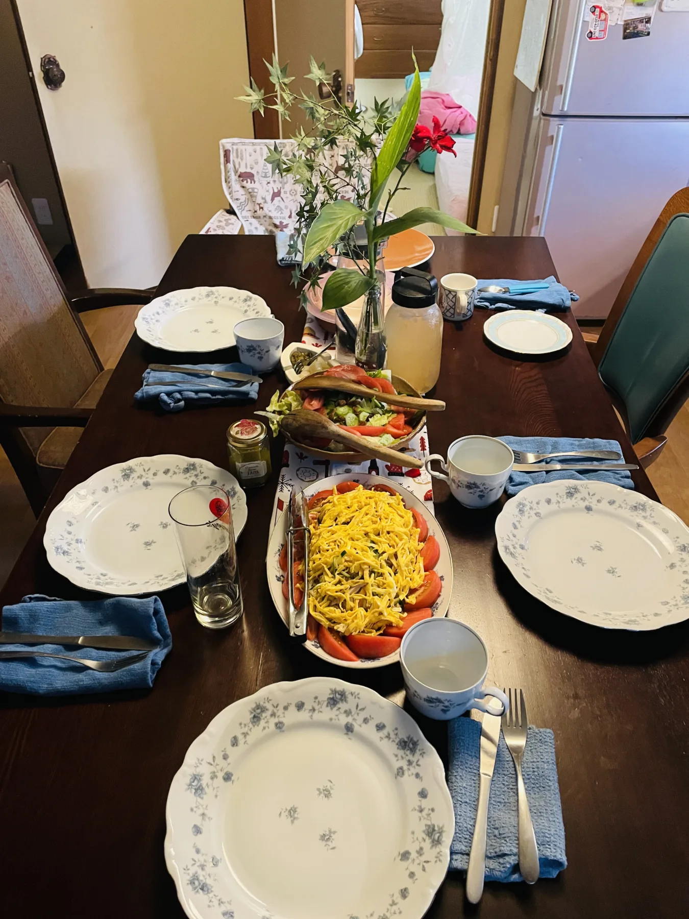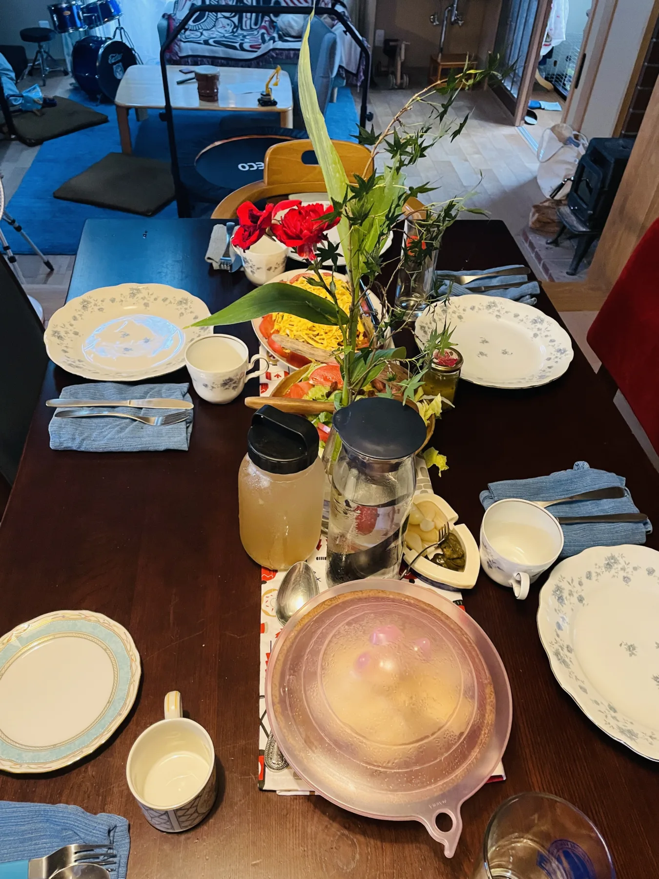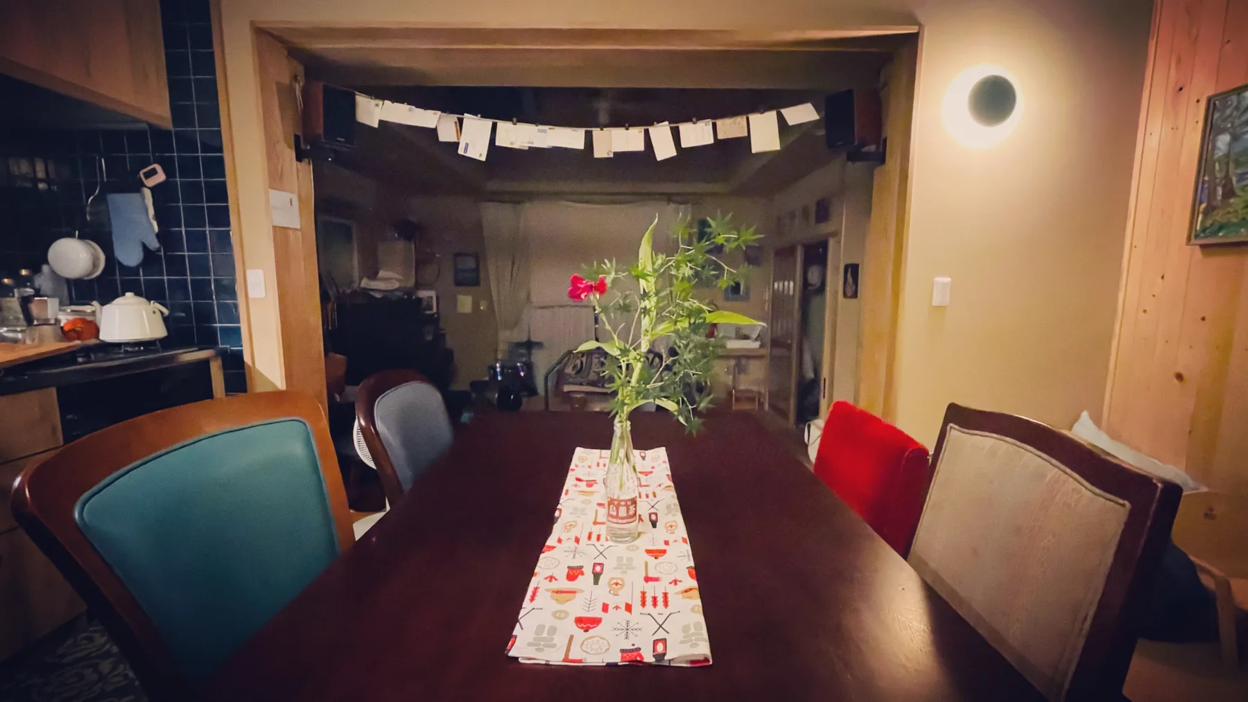 Tsuchida Cottage (post-dinner) table setting with my flower arranging & postcard string on speaker wire (heavy gauge) / #postcards from sri lanka, austria, ireland + japan, canada, usa etc