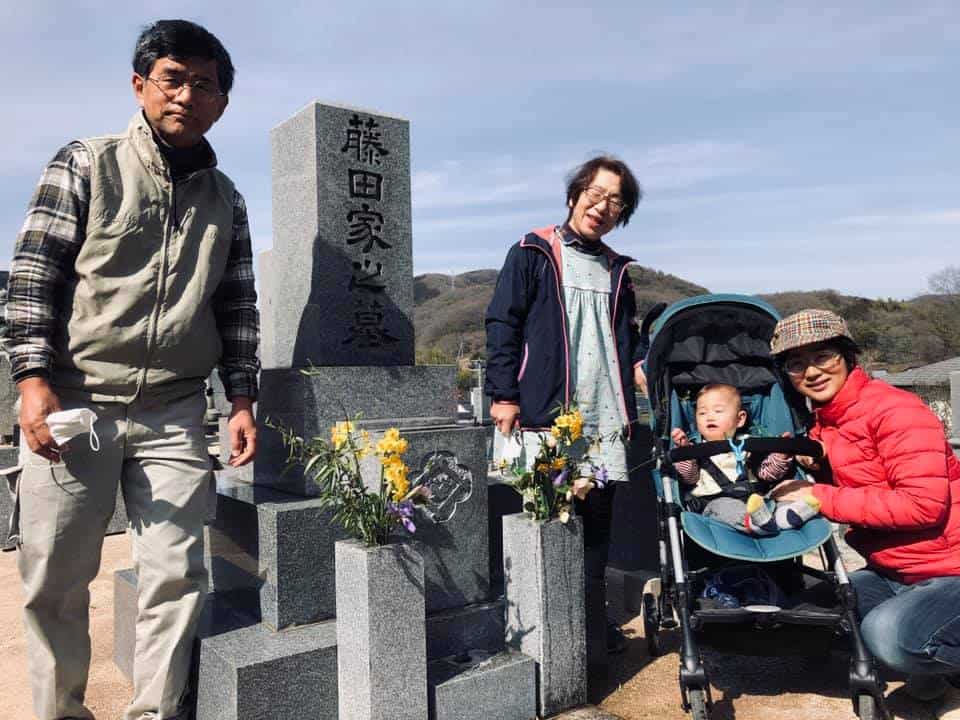 4 generations of Fujitas, more or less art Grandfather Ichiro and now Grandmother Tomiko’s ohaka (grave) short walk from our home in Tsuchida, Okayama. We cleaned the ohaka, lit incense, fresh flowers, clap clap, bow, bow etc.