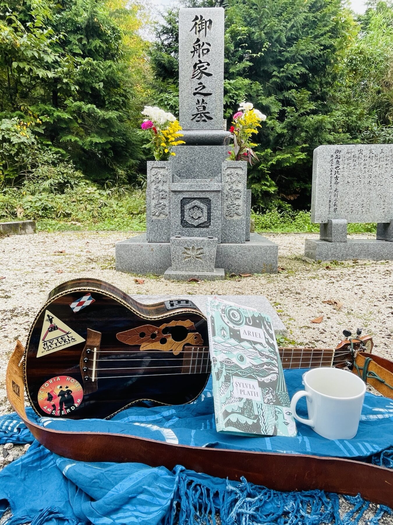 Me with ukulele in front of a Japanese grave site, surrounded by splendid mountains and brilliant women. Sharing memories, condolences, and a few meanderings and musings about the miracle of death — with a special dedication to my grieving Uncle Bob and all of my cousins.