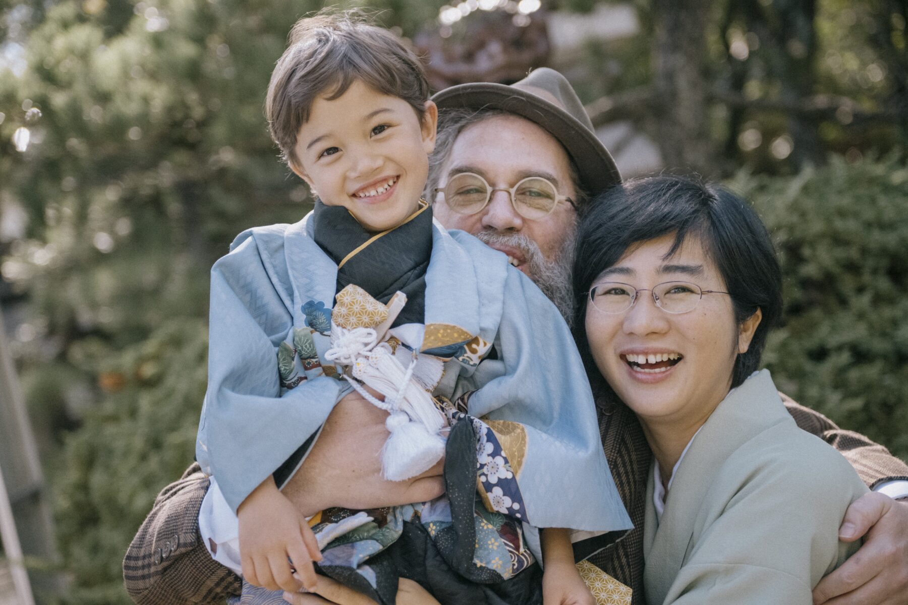 The front (recto) mounted on assorted pink brocade washi paper is a photo by Matsushita-san – Ryoko’s former classmate – of Homare Atelier photo studio, taken at Munetade Shrine at Ichiro 3-5-7 day celebration. Mom and him are in lovely traditional wear while Dad in the back holds the gang together with his hat just staying put. And Ichiro especially loves the shrine guardian looming behind us like a fourth member of the family