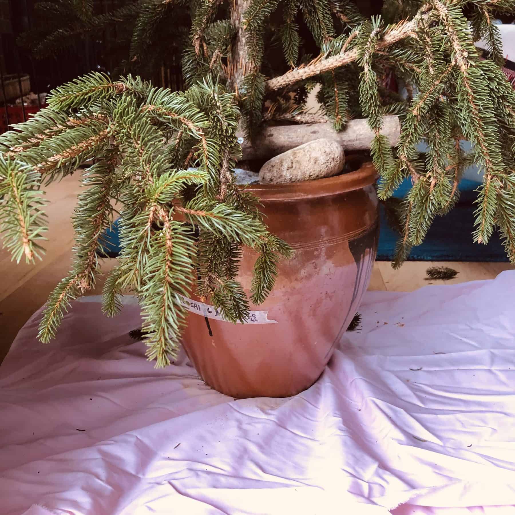 and tree “installed” with wooden braces, heavy rocks/stones in a crockery vessel (which recently held umeboshi)