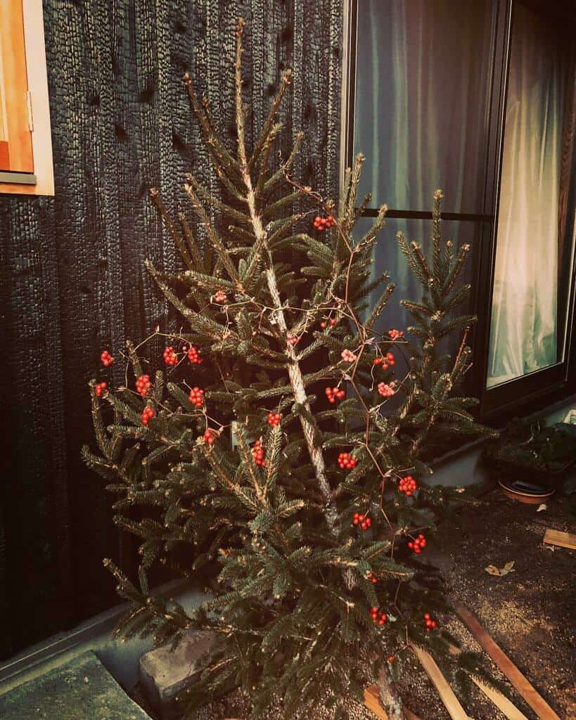 Festive times impending at Tsuchida Cottage / arborist wife perks equals Christmas tree, cut yesterday (from private land by Oka-san) – its sappy and prickly (and rare!)
