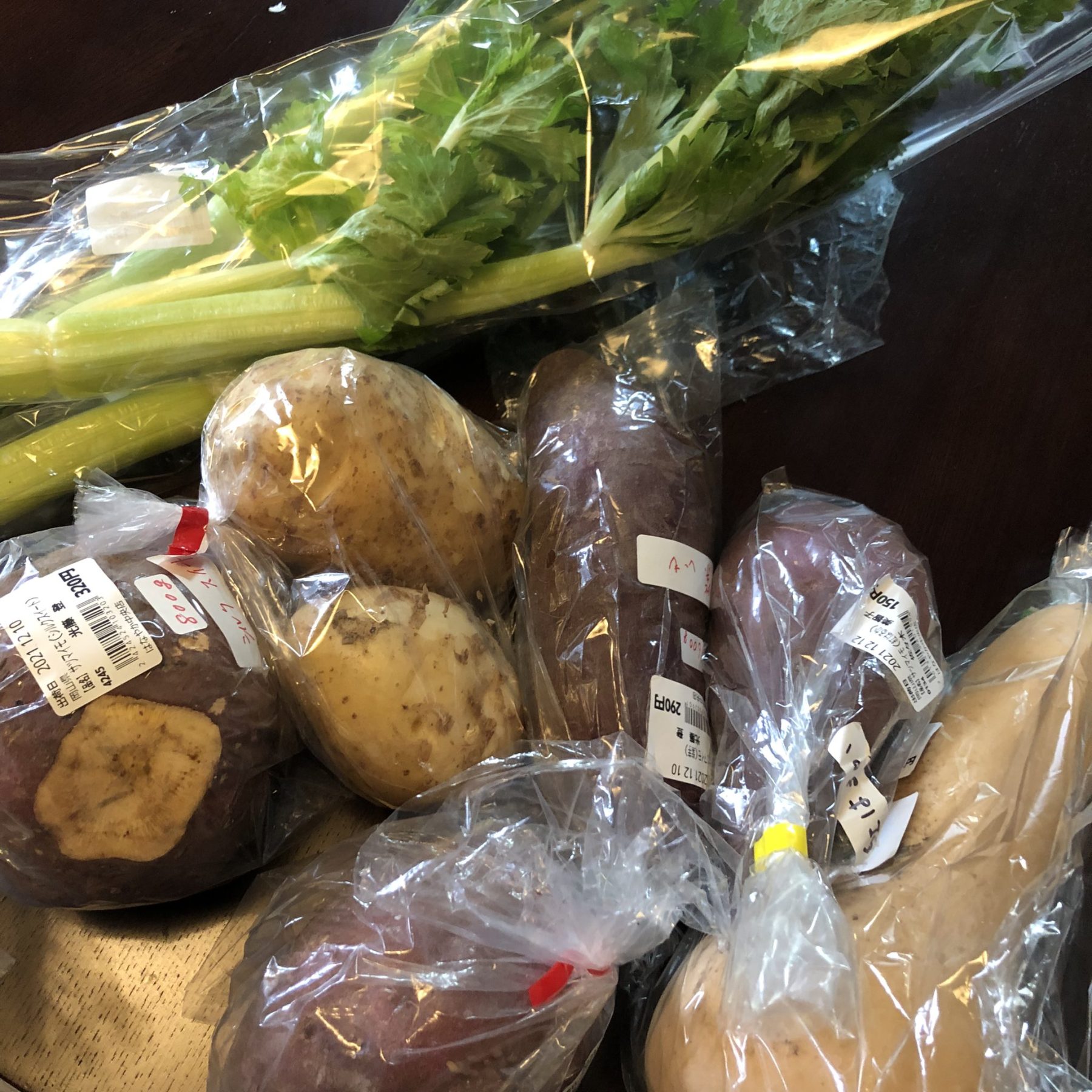 Somehow I came home with celery that’s over a meter long, a daikon radish almost the size of my leg, and a whole lobster + intended brussel sprouts & variety of potato/tubers.