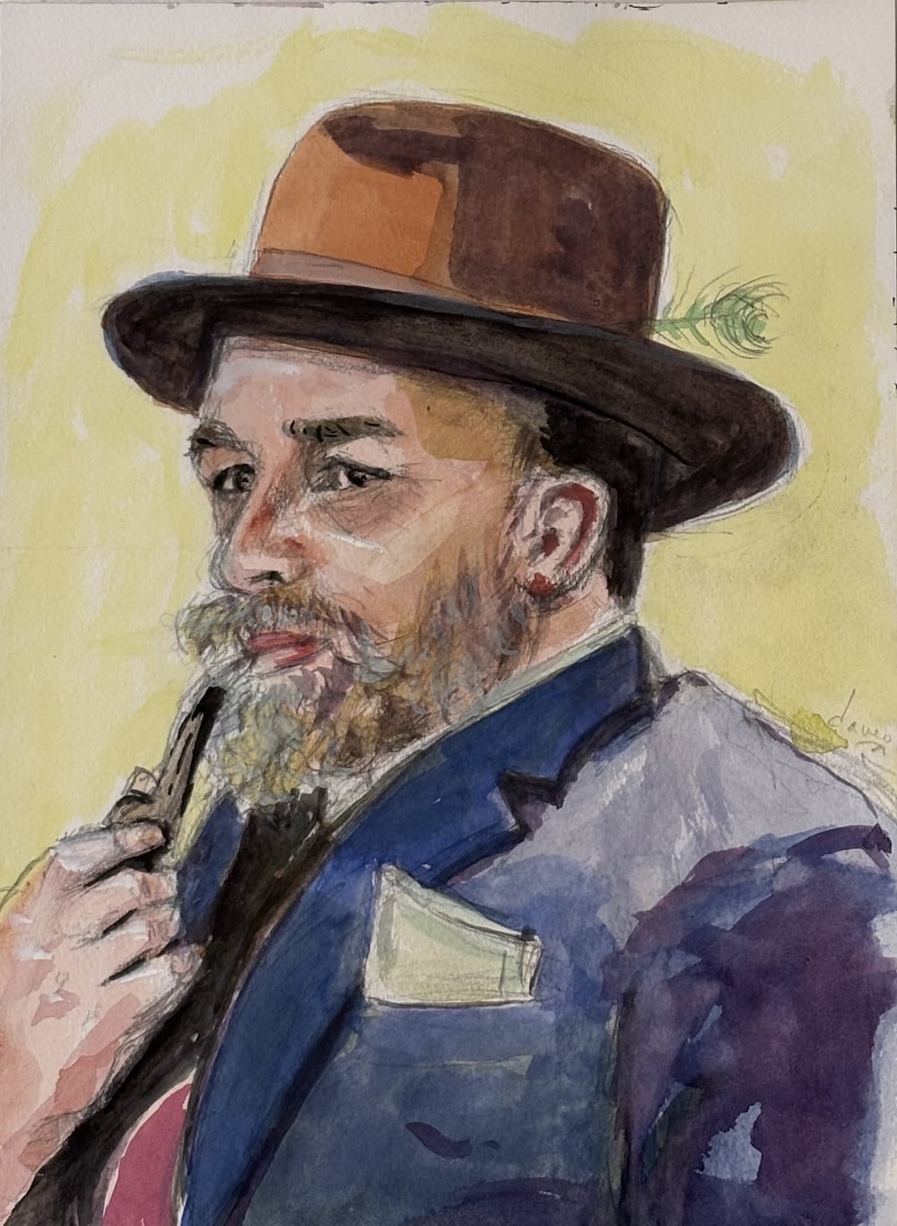 [April 13 2025] Just a little check in to say that I made it out the door, amidst a sudden rain storm that makes it feel like November, looking sharp wearing my tailored blue herringbone suit, a sort of carnival barker top hat, have a peacock feather in the bag just in case, a striped shiny shirt and contrasting tie which should look interesting for the drawing class participants with a few different outfit modifications (vest, different type, different shirt) and accessories (book, camera, pipe)