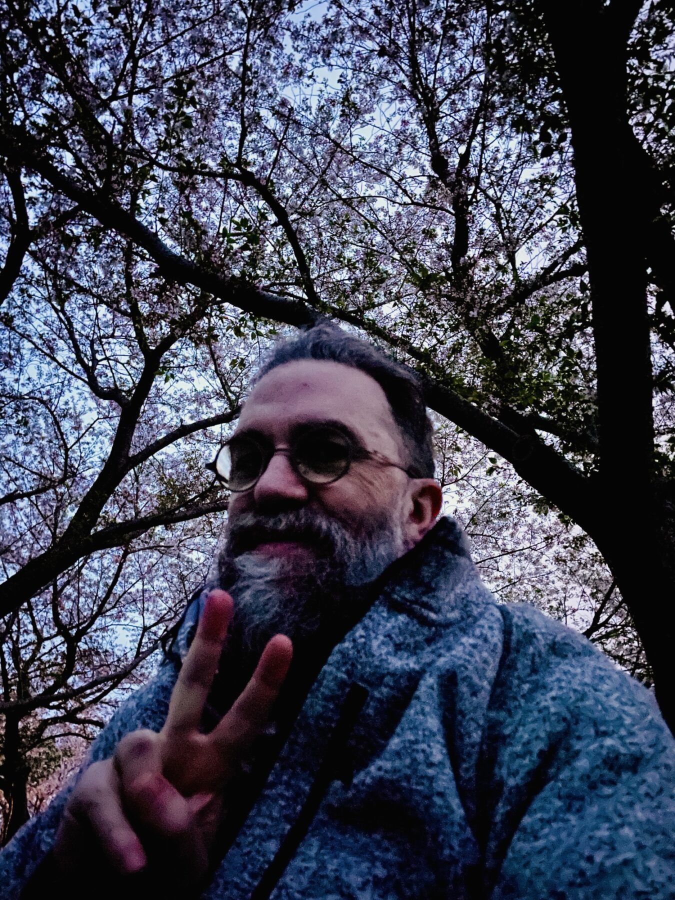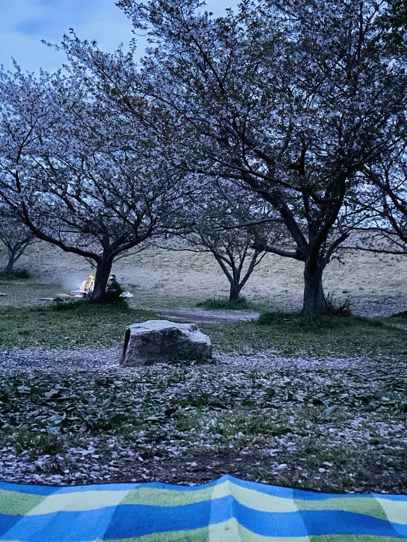 [April 12] Since I’m here, I’ll tell you about being under a cherry blossom tree last night when I ‘snuck out’ with the family for a night time hanami – nothing fancy and nothing involving a couple hours of preparation and pulling out the camping wagon and all the equipment…