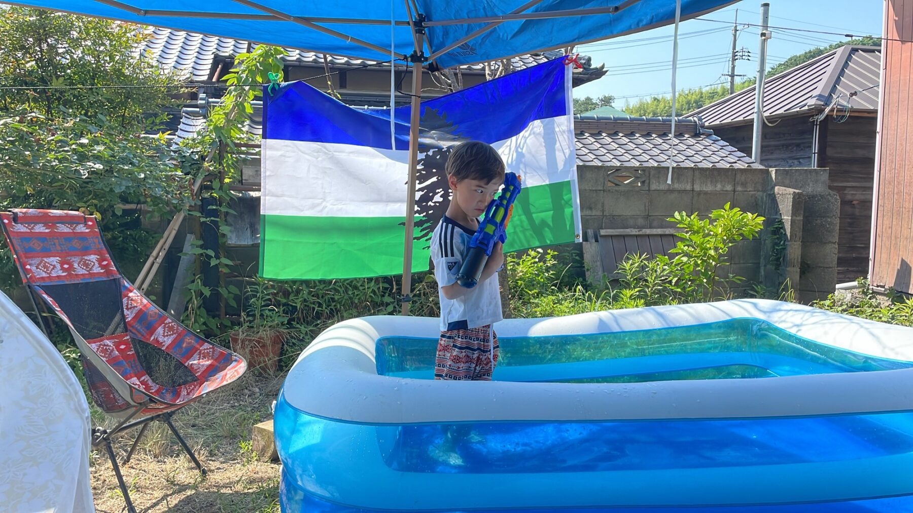 I also set up the pool for summer fun along with flags and awnings and chairs to make “Tsuchida Beach Club” which, while enjoyable once it set up, takes a tremendous stack of energy for me to set up the block base and panels for the whole thing to mount on and running the strings, running cord for the pump and running the hose and all of that… I would very much like a photo of my kid in his snappy outfit without the gun but people keep on giving him guns of different kinds as presents as well as knives – wtf