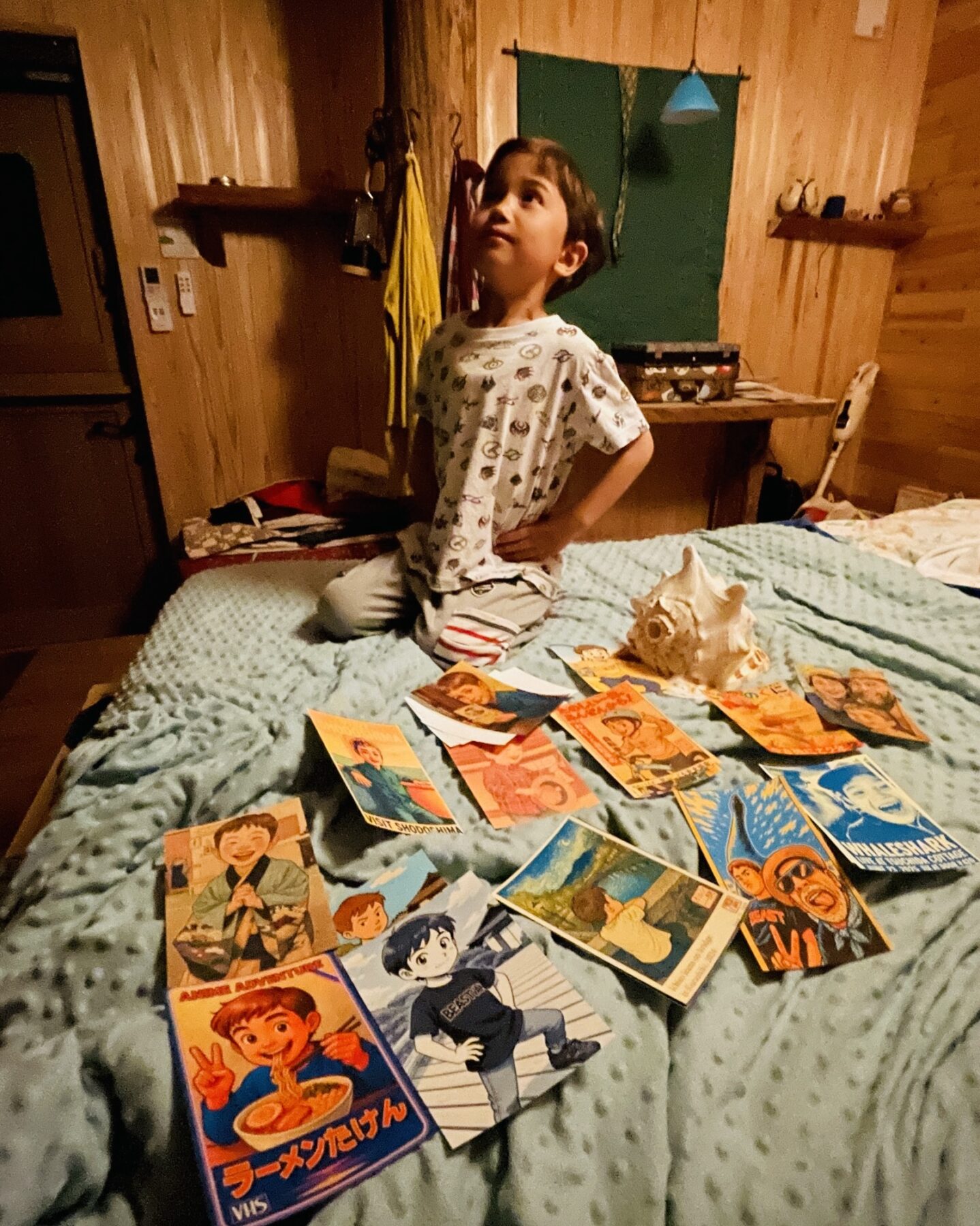The wonderful gentleman at the café and I exchange postcards, either by post or bring them when I visit, in this case I presented him with one of the foldable zines made for Ichiro’s birthday party (he had helped us source hamburger buns amongst other advice) as well as a choice of postcards from the wide selection of the well, postcards made for the birthday