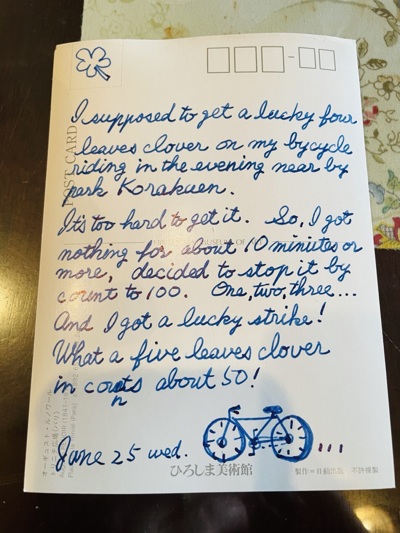 ++ Apricots, plums, tea ceremonies, ice creams, a planetarium, a lot of dinosaur stuff, a lot of Lego blocks (often of robot things I don’t understand), buying interesting stocks for Ichiro’s savings so he can cheer for them like sports teams (except unlike the sports team I cheer for they won’t fail continually for their entire existence), visit to shrine and temples, always with the postcards and sometimes with the zines — and trying to move forward on my poetry book “a circumnavigation, of sorts” but there is laundry to fold, dishes to wash, baths to fill and lists to check off… so we go on