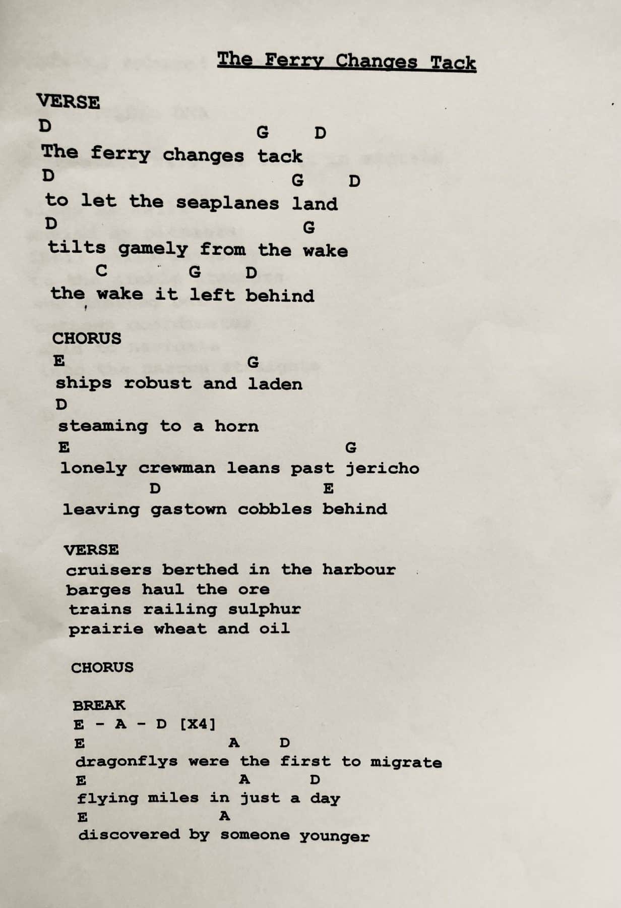 Since I’m here, chords for “ferry changes tack” song – words by me, circa 200x, music by Bread – 3/4 time.