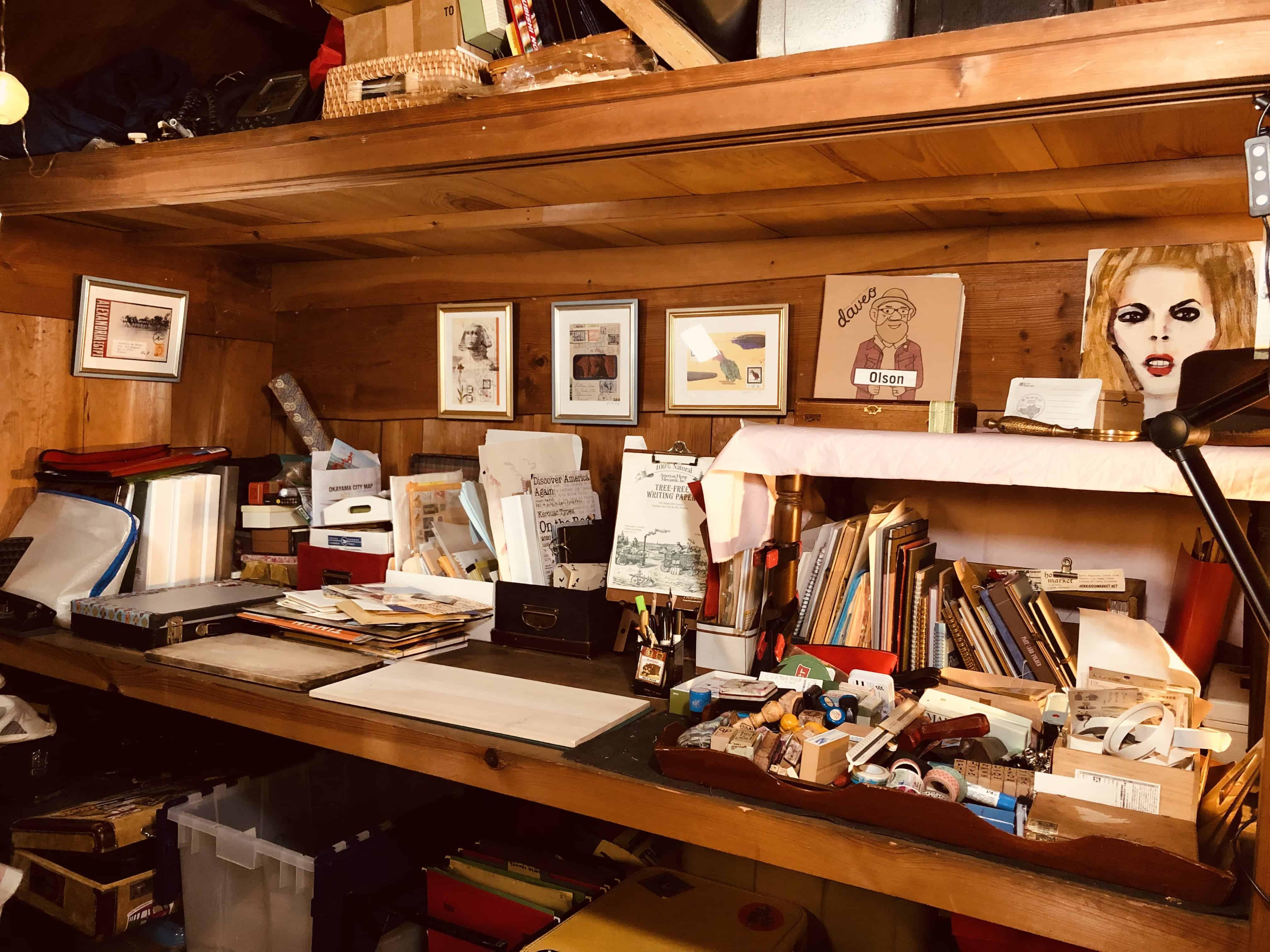 Here’s the upstairs workbench in current configuration, space for audio, video, scrapbooking, painting, sort-ganizing / You’ll also notice and overhead scanner maybe, and various stands for old phones/cameras.