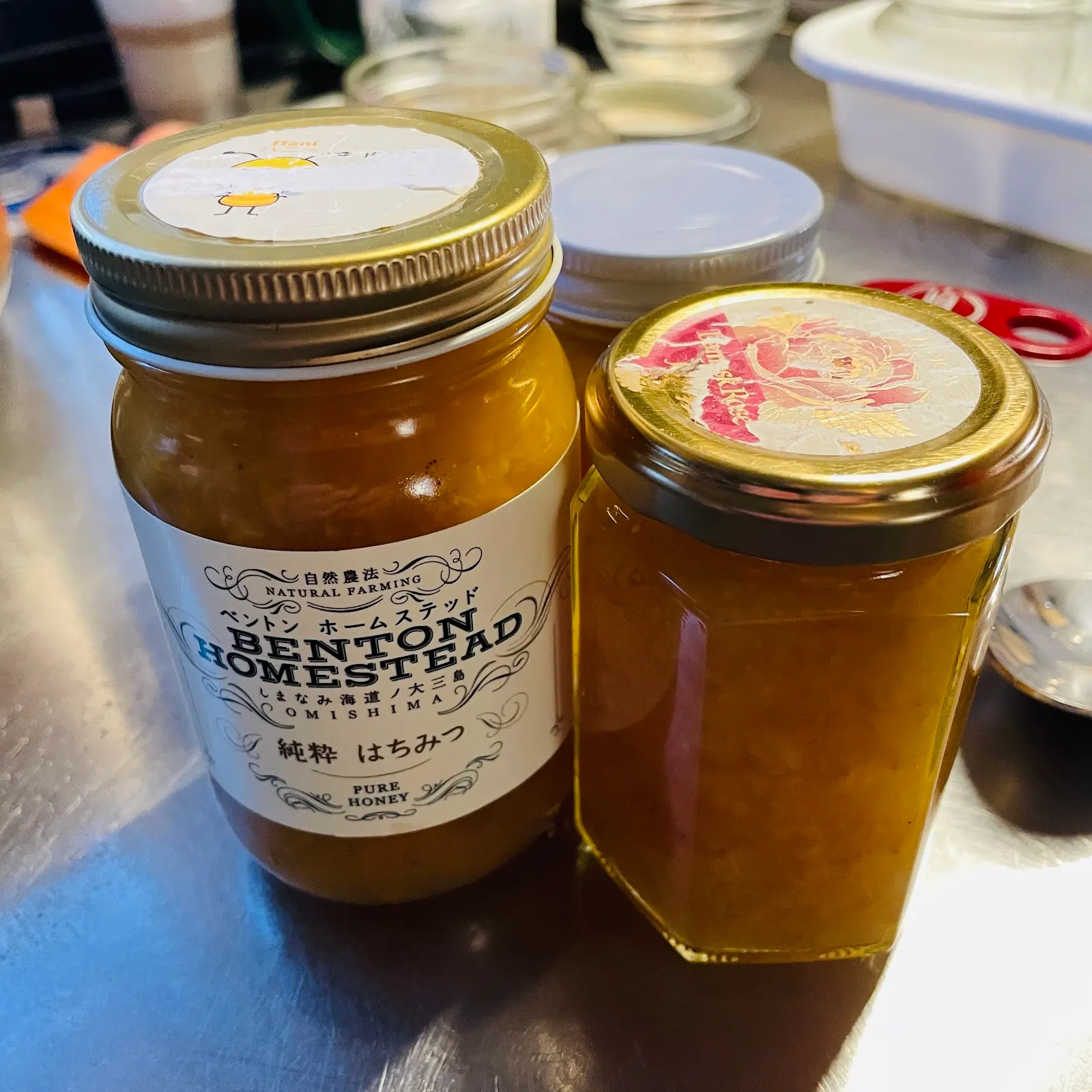 Keen observers will note @bentonhomestead honey jar re-purposed for 3rd time (jams/marmalade = blueberry, kinkan, yuzu)
