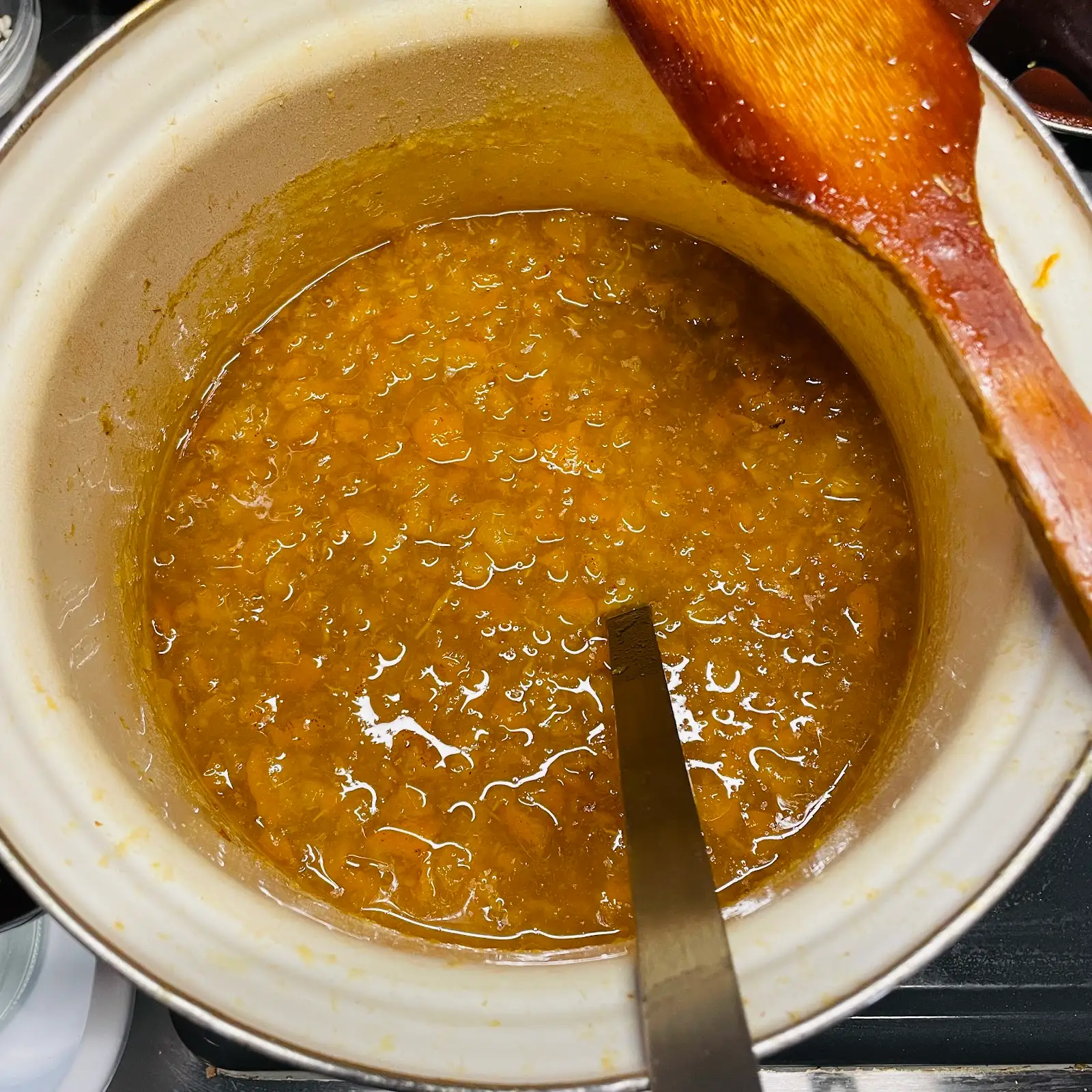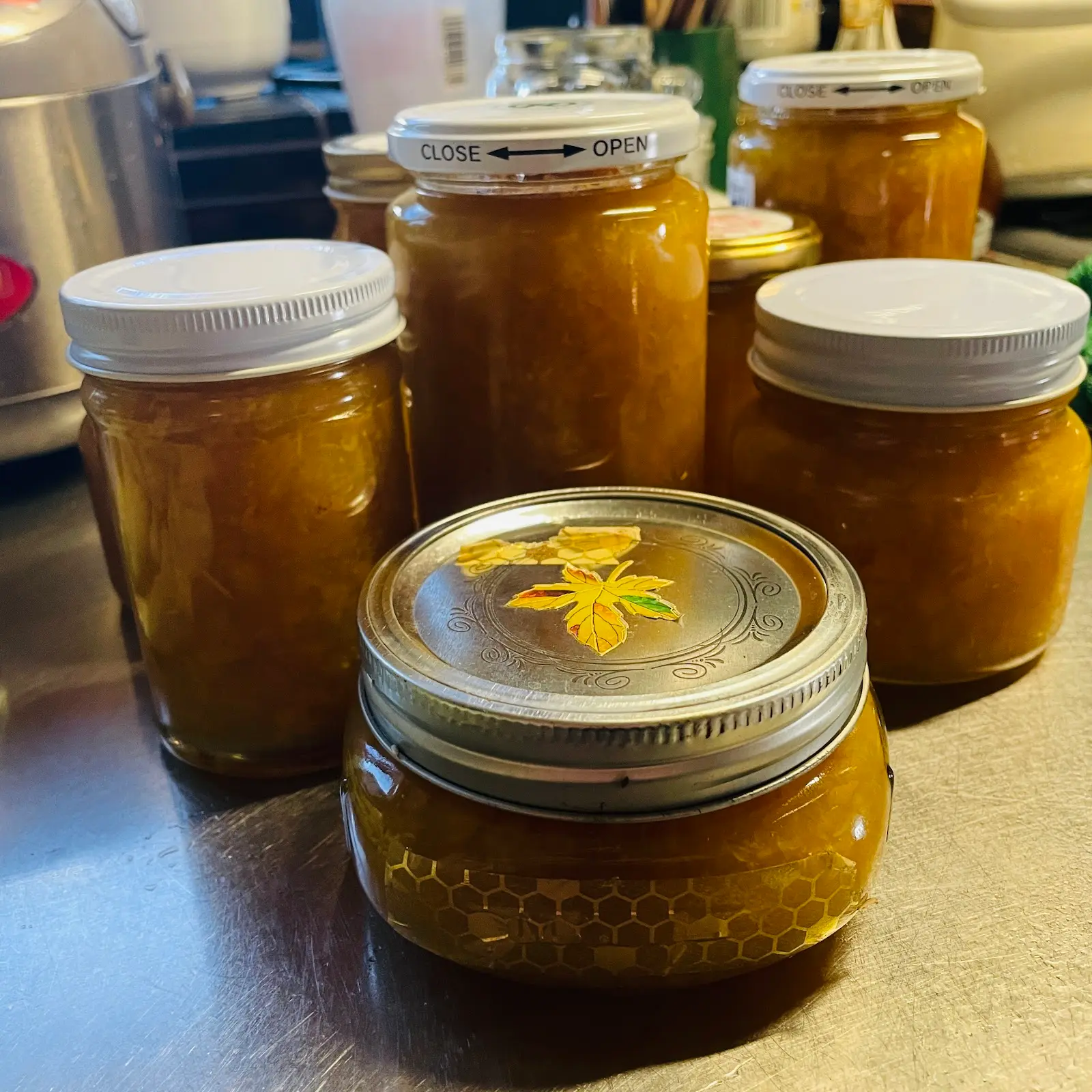 Simmered on a woodstove with cane sugar, bottled in miscellaneous jars (but the ones used for pickling previously because they’re smelly even boiling :-))
