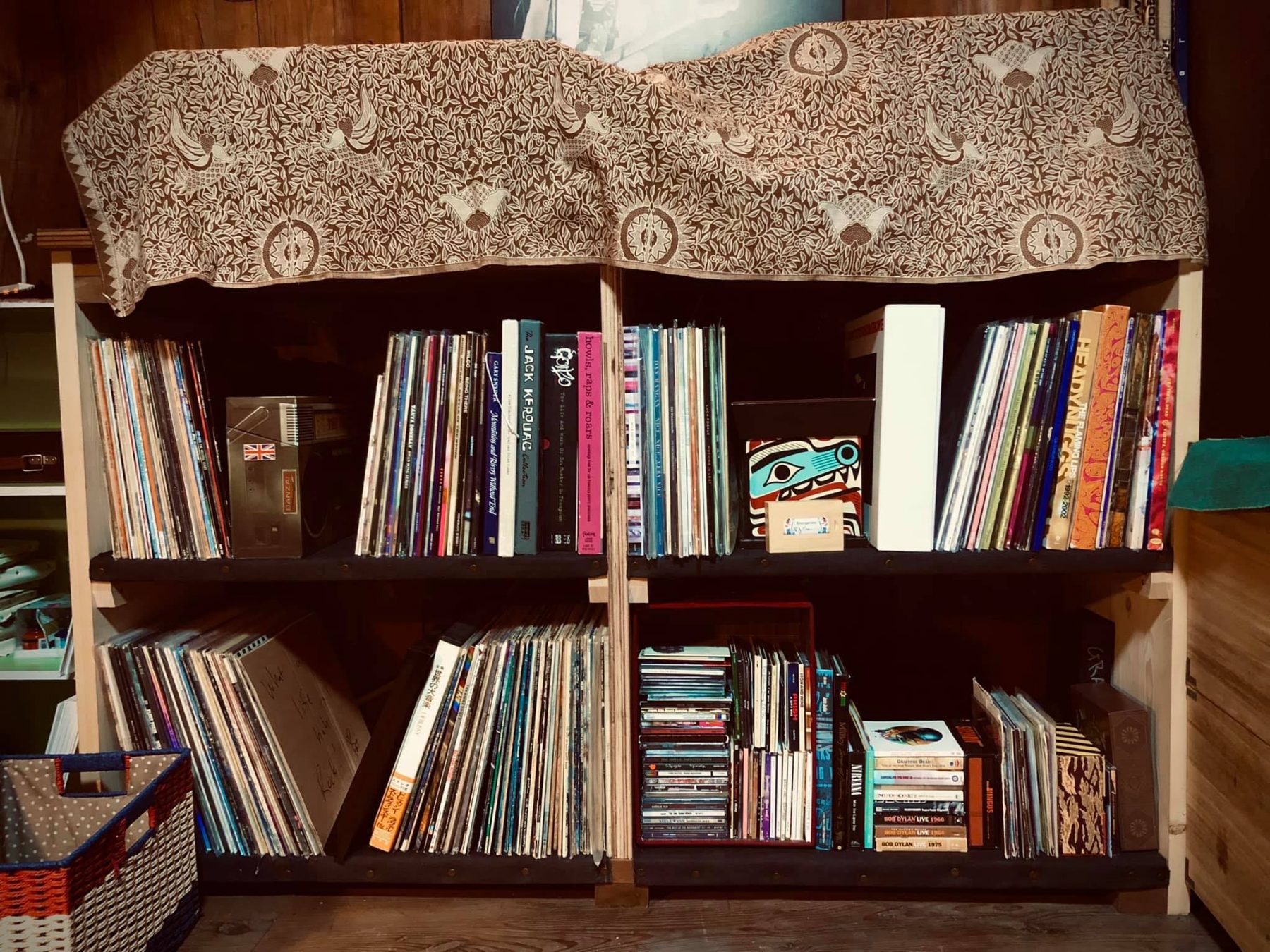 Hemp cloth wrapped on shelves made from wedding dais / under the dust cover is 1982ish Yamaha GT-2000 turntable & analog amp plus TEAC cassette/CD/usb/1/4” deck. Thats not *all the records* but a solid batch.