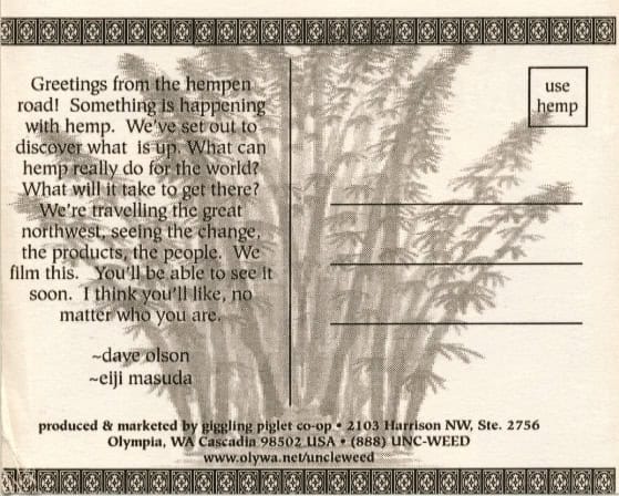 A promotional postcard for the HempenRoad film project Made while we were still in production, printed on 100% hemp cardstock paper (from Ecosource in Victoria ,BC) and mailed all over to wrangle up support and excitement about the project.