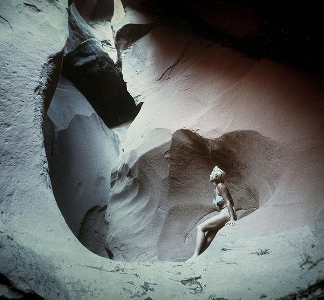 In 1954 she made her first river trip through Glen Canyon and was captivated with the beauty of the sculptures and the allure of ever-changing waterways. She discovered the majesty of formations such as the Music Temple edifice, where her own voice surrounded her and echoed off sandstone arches. She preferred bathing in the buff in the cool pools to “feel that water running over my body, and feel the sand pickin’ away at my skin, and feel a rock, and getting in step with the stone.”