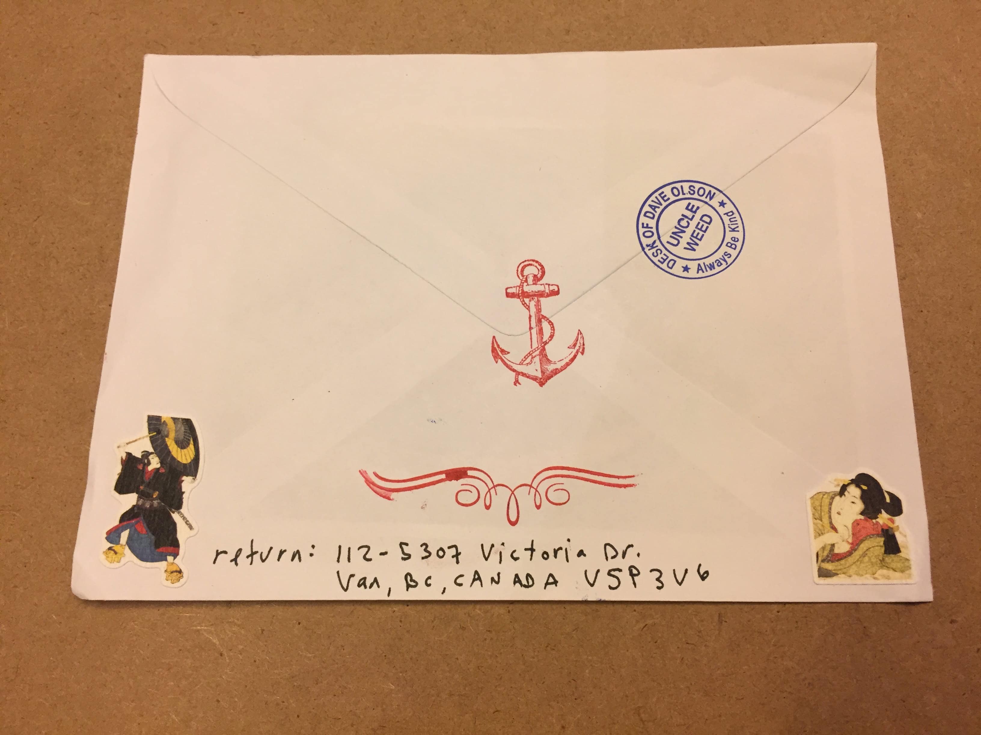 To remind and inspire myself, i often photograph envelopes before they embark on their journey. The fronts contain folks’ personal address (which i shoot to keep a record i never actually look back upon to recall who i’ve mailed) so i shan’t share that bit, but i will gallery up the backs – really for no purpose, just for amusement and artsy funtimes.