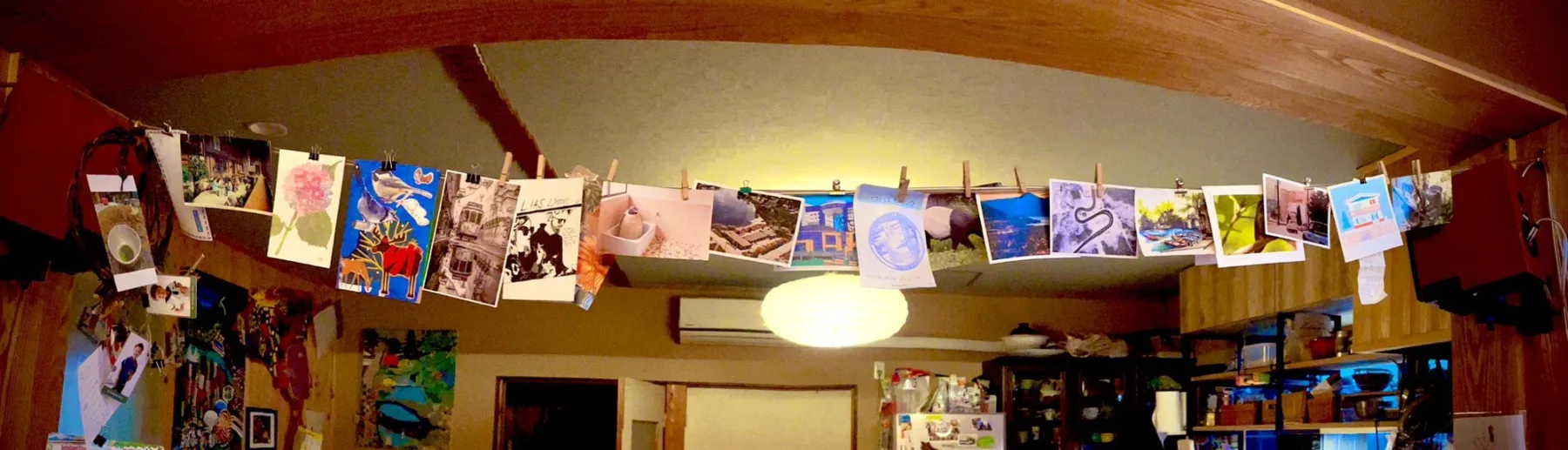 Current postcards hanging on the “string of honor” – (also stereo speaker cable) filled up so needs to be archived into dossier soon / It’s an incredibly pleasurable experience curating and archiving but also just receiving and enjoying.