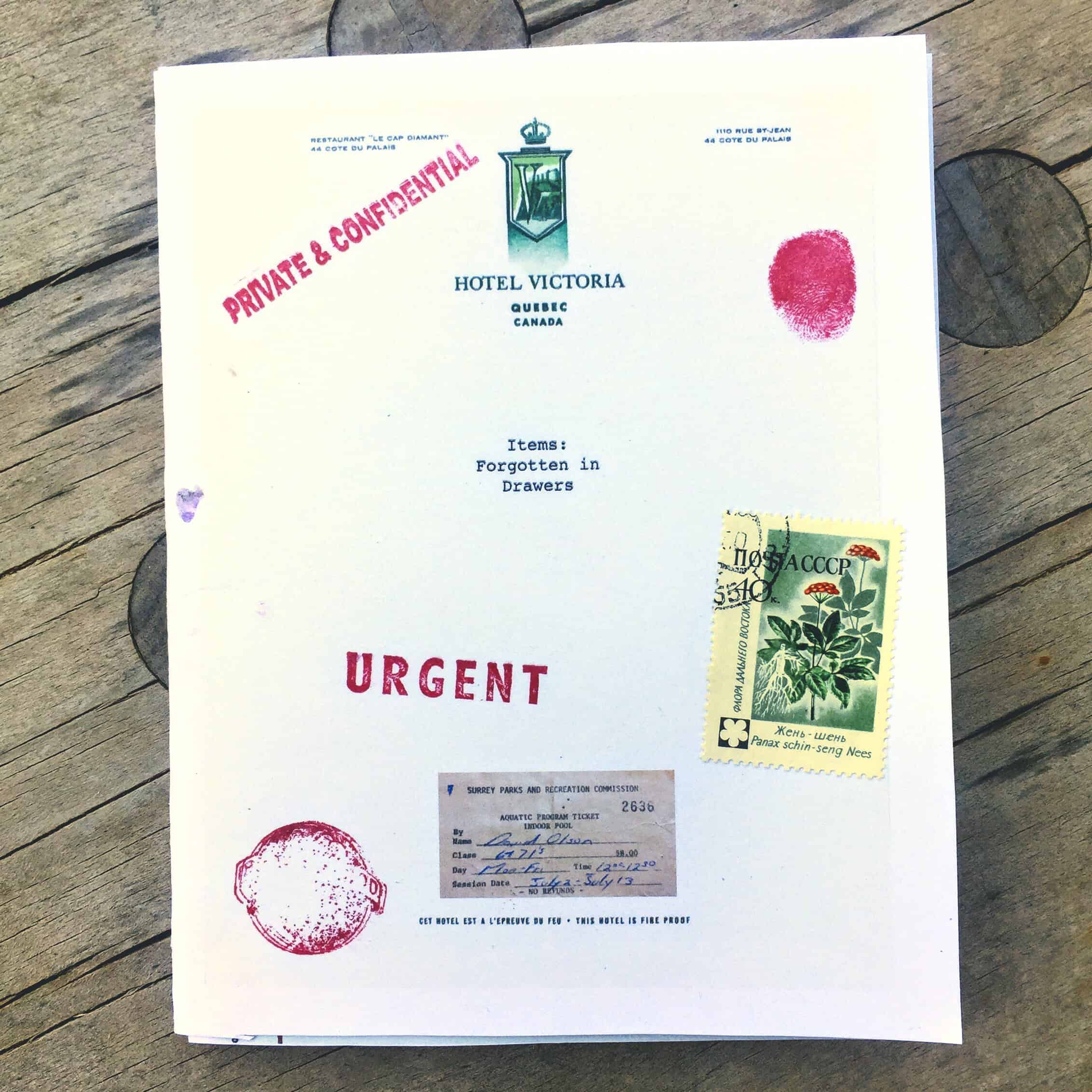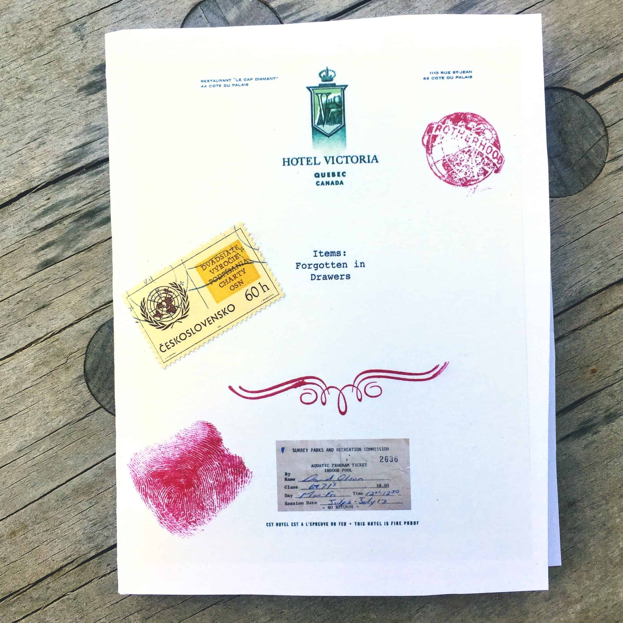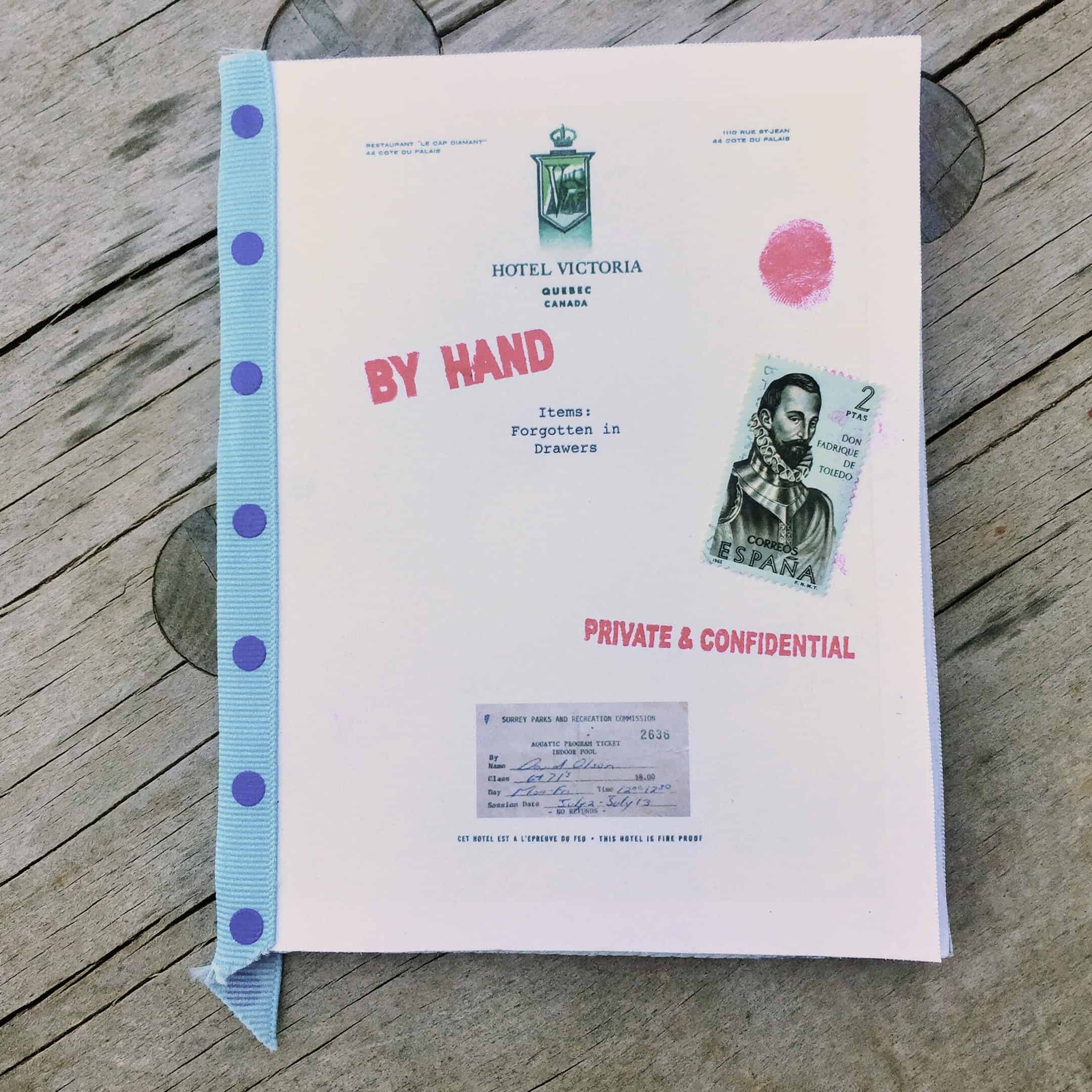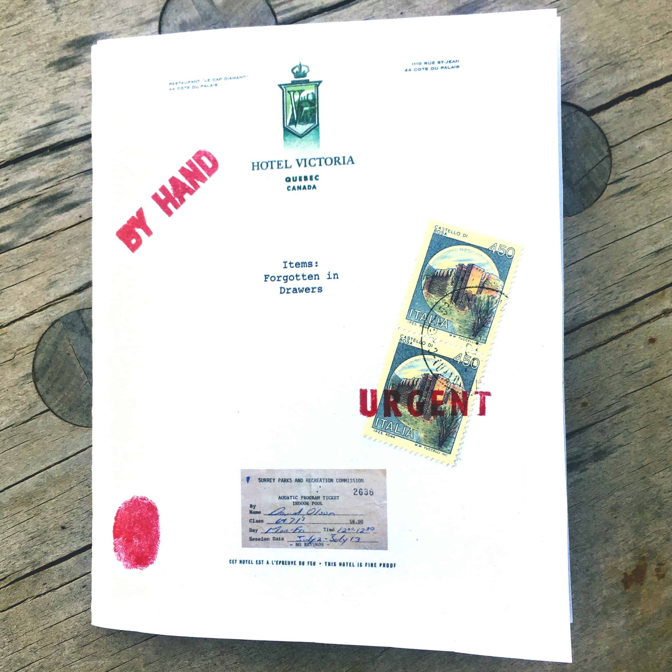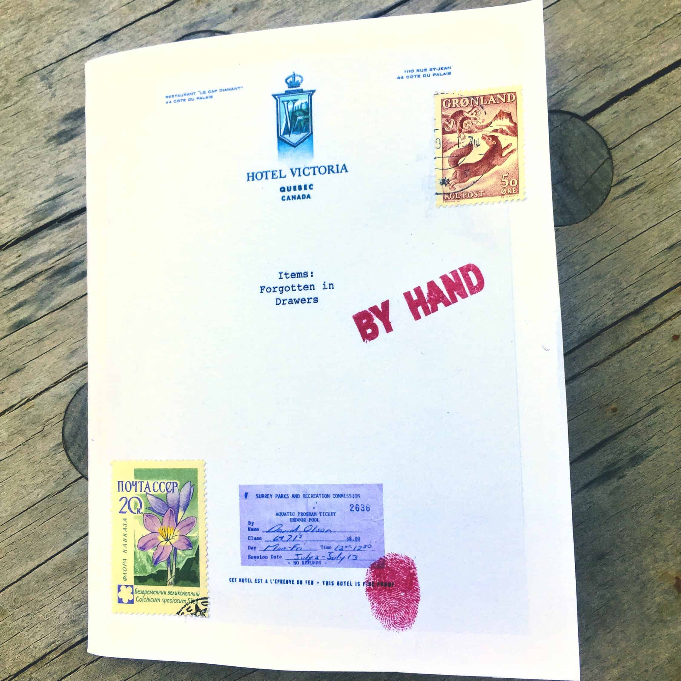 A collection of chapbooks called “Items: Forgotten in Drawers” made in 2017 from handwritten poetry created in Asia, Arabia, Mediterranean, then (roughly) transcribed and printed in BC, cut and glued to vintage hotel stationery in Montréal, bulk printed and collated in Vegas, assembled in Utah, and given as gifts for my birthday. Each one hand-cut/stitched and (obviously) uniquely finished with stamps (postal and inky), with affection. Run of 12 if I recall, most documented here. Turns out this collection is “Volume 1” as more similar collection have followed.