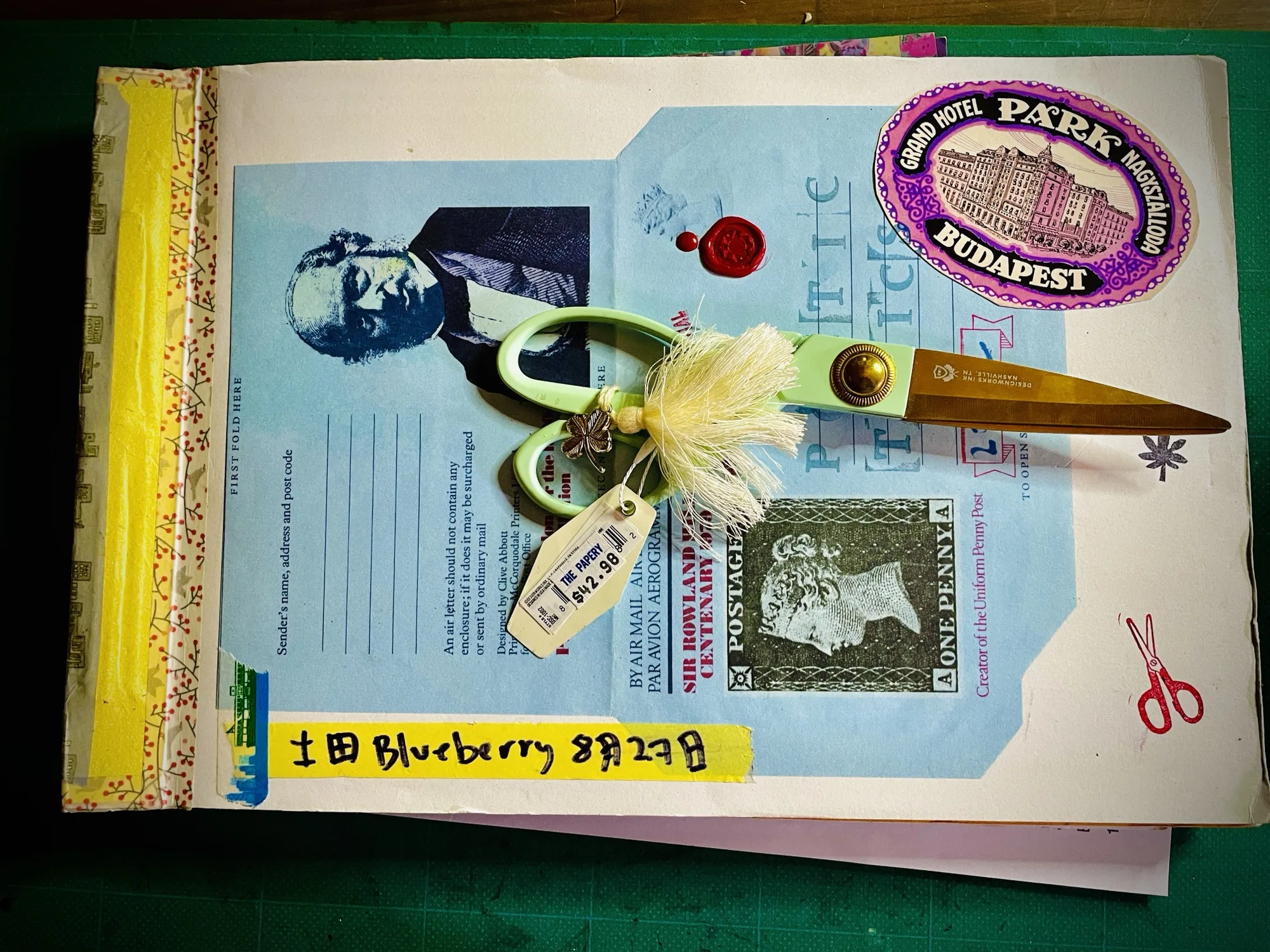 Scrapbook cover: “poetic tonics” // handed-crafted w/ Aerogramme cover // shown with magnificent scissors purchased at The Papery in Victoria, BC (price tag still attached because very cute & still thrilled i have such a magnificent pair of scissors, purchased new)