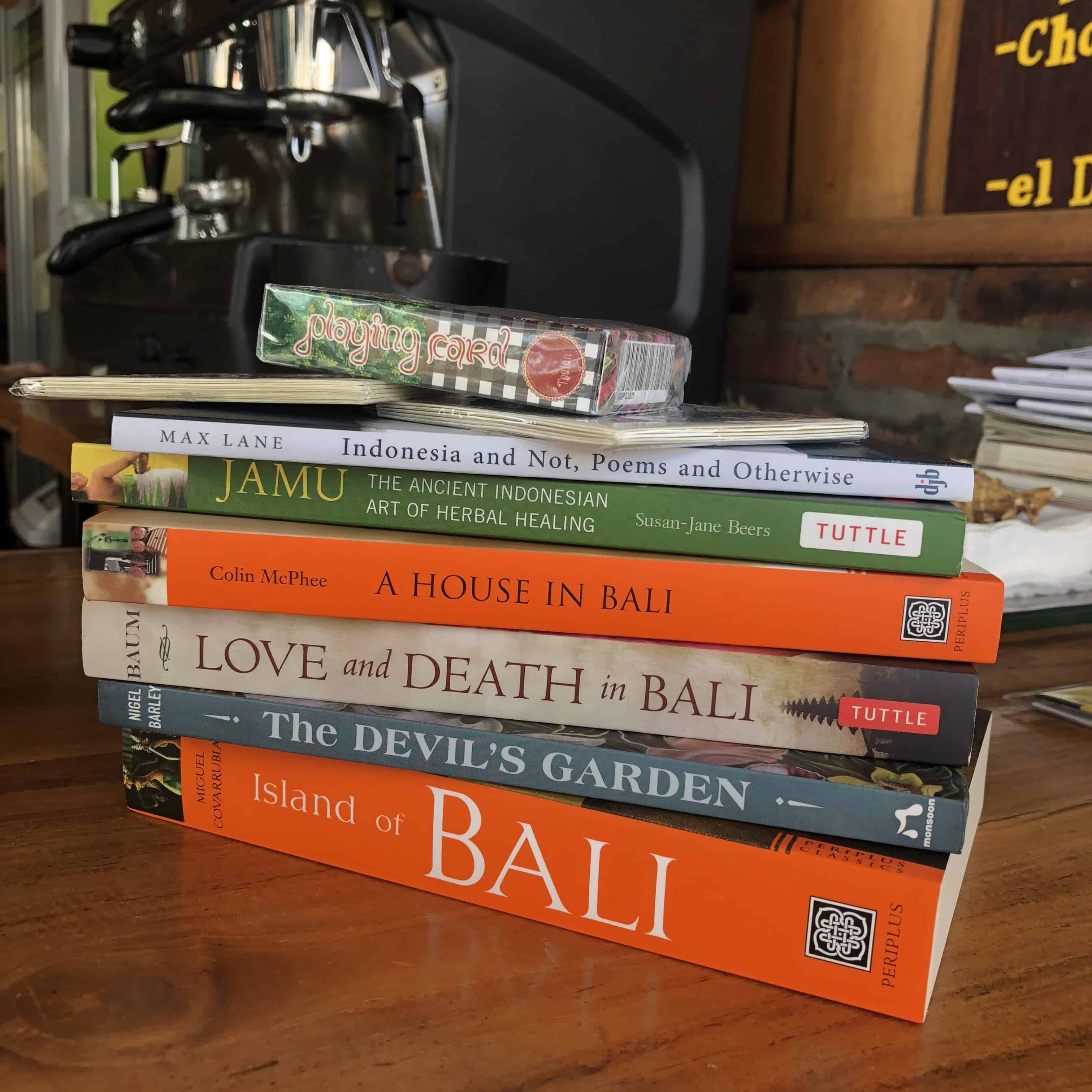 some lovely small greeting cardsThe Devil’s Garden by Nigel BarleyIsland of Bali by Miguel CovarrubiasA House in Bali by Colin McPheeLove and Death in Bali by Vicky Baum (foreword by Nigel Barley)