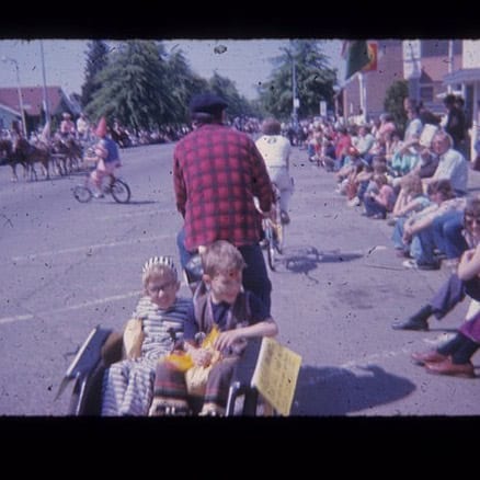 Oh brother where art thou? Turns out he’s right next to me in the trailer as Dad, as a Coureur des bois, pedals us along in a parade in the quasi-Dutch town of Lynden, Washington.