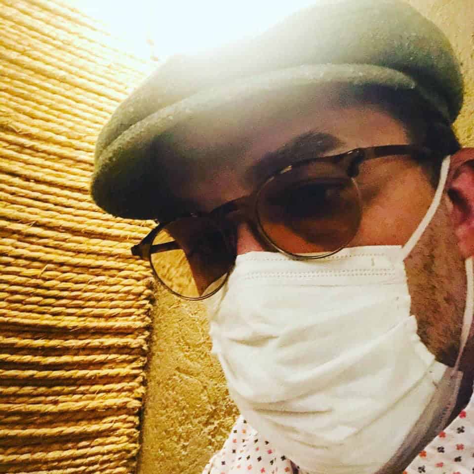 A weary-looking gentleman, wearing a handmade green flat cap and a white mask covering nose and mouth but exposing several days stubble on cheeks, shows new spectacles – “Clubman style” with brown tortoise shell design on upper half and gold wire on the bottom half, while seated in front of a rope and mud wall with lighting overhead, at a restaurant specializing in cutlets upon rice.