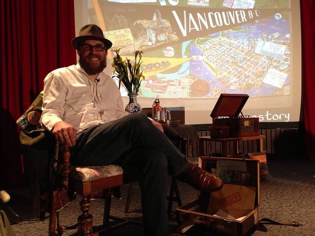 Storymaker Dave uncleweed Olson shares an eclectic variety of stories from Vancouver’s counter-culture history on a stage adorned with a record player, campfire & cub scout blanket, art easel, flowers and an Expo 86 mug – plus pulls artifacts from an old-timey suitcase to illustrate forgotten past of a city which is/was much cooler than most realize.
