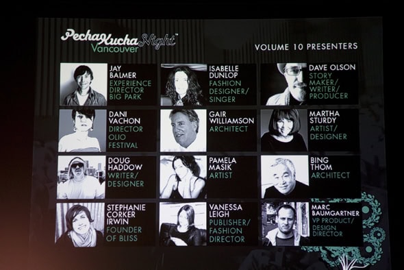 The presenters included: Jay Balmer, Isabelle Dunlop, Dave Olson, Dani Vachon, Gair Williamson, Martha Sturdy, Doug Haddow, Pamela Masik, Bing Thom, Stephanie Corker Irwin, Vanessa Leigh and Marc Baumgartner.