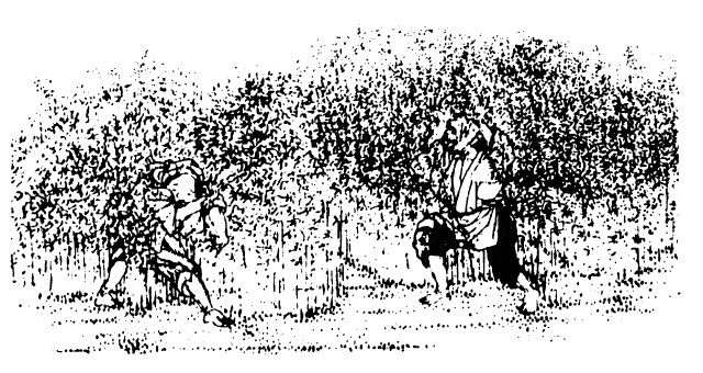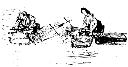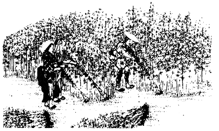 One of the most celebrated paintings of its time, Shimizu’s Taima Shukaku (Hemp Harvest) painted in 1929, depicts farmers cutting down thick, dense hemp fields, surrounded by a vibrant valley (Marui 1997). Woodcut prints from an artistic agricultural text of 1979 show the same dense fields. The caption explains how one must walk through the fields to “ventilate” the plants. Other captions explain various well-evolved processes including a three-step water retting technique and also explain a means of bleaching with alkaline chemicals like potash and caustic lime (Wein 1997).
