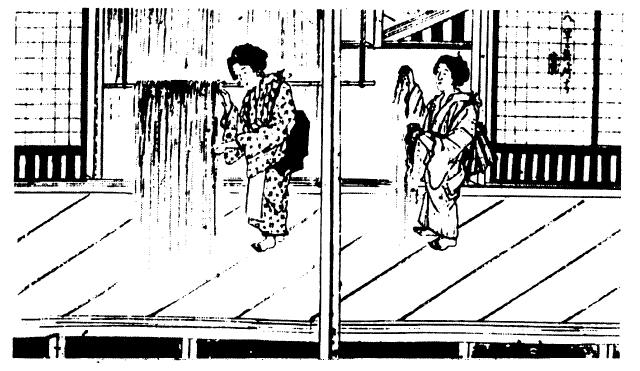 “At Shinto jinja (shrines) and Buddhist tera (temples), certain objects are symbolically made from hemp. For example, the leg-thick bell ropes, and the noren, a short curtain that hangs over the doorways and brushes the top of the head as one enters the room, must be hempen. The noren acts as a symbolic purification rite, meant to cause evil spirits to flee from the body.” (Robinson 1996)