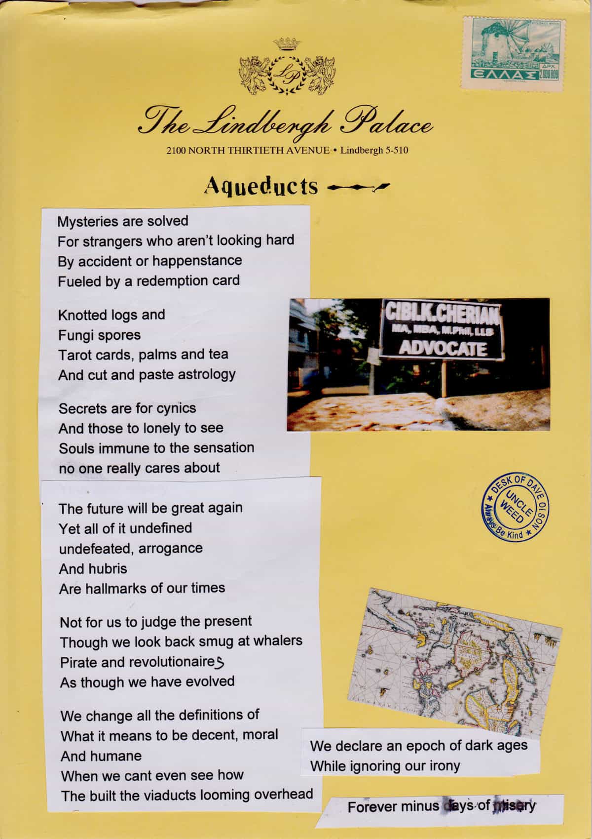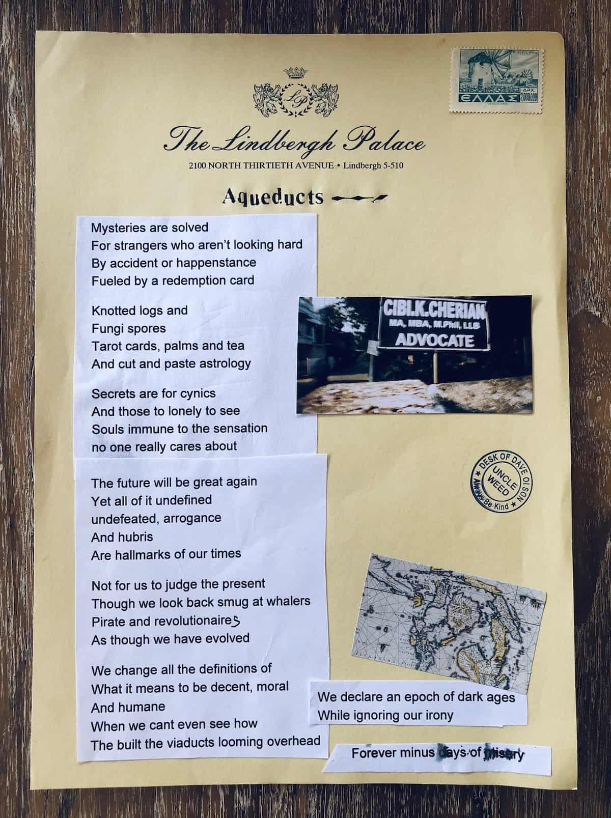 Aqueducts. mysteries solved – Items: Forgotten in Drawers (vol. 6, Circumnavigation) Aqueducts. mysteries solved – Items: Forgotten in Drawers (vol. 6, Circumnavigation) Tags: aqueducts, circumnavigation, ephemera, freeverse, hong kong, hotel, items forgotten, letterhead, mixed media, poems, poetry, Stationery, vol. 6