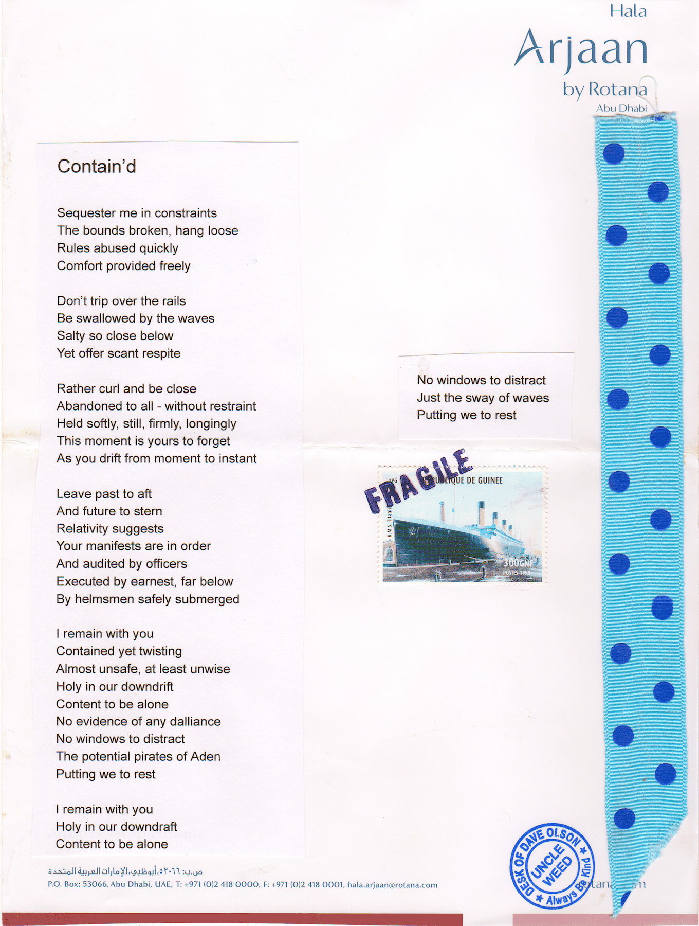 Contain’d – Items: Forgotten in Drawers Tags: ephemera, freeverse, hotel, items forgotten, letterhead, mixed media, poems, poetry, Stationery