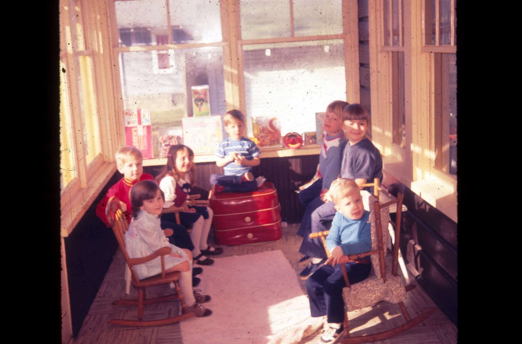 this is brother Bob’s (straight ahead) birthday March 1973 so i (front right) was 2.5 years old / for years i recalled this photo somehow and then going through my dear late Mom’s slides, found this and *knew it* instantly / that screened in porch, the sun, and everything.