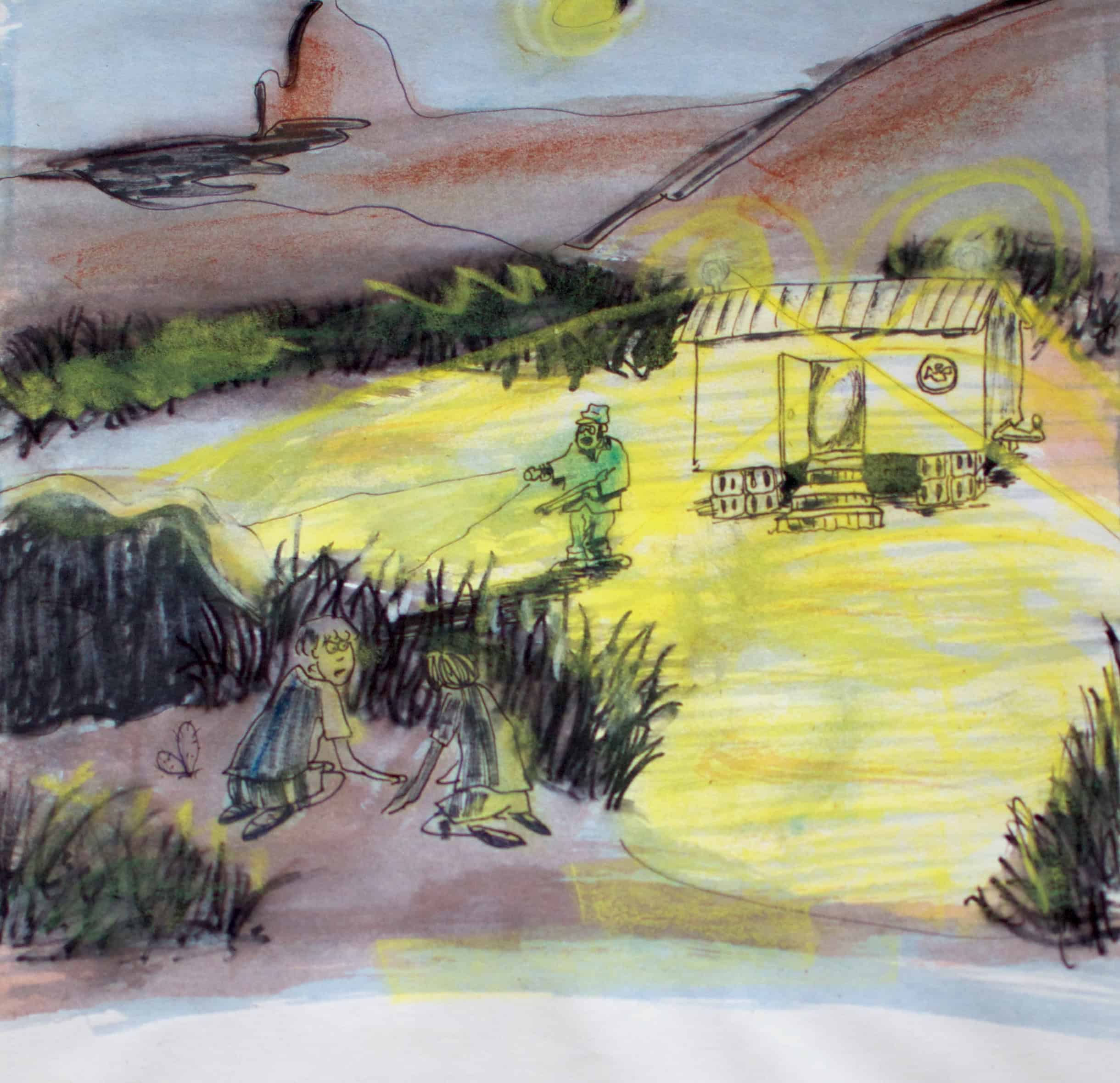 Searchlights switched on, illuminating the desert floor as the gang of three dove and hid.