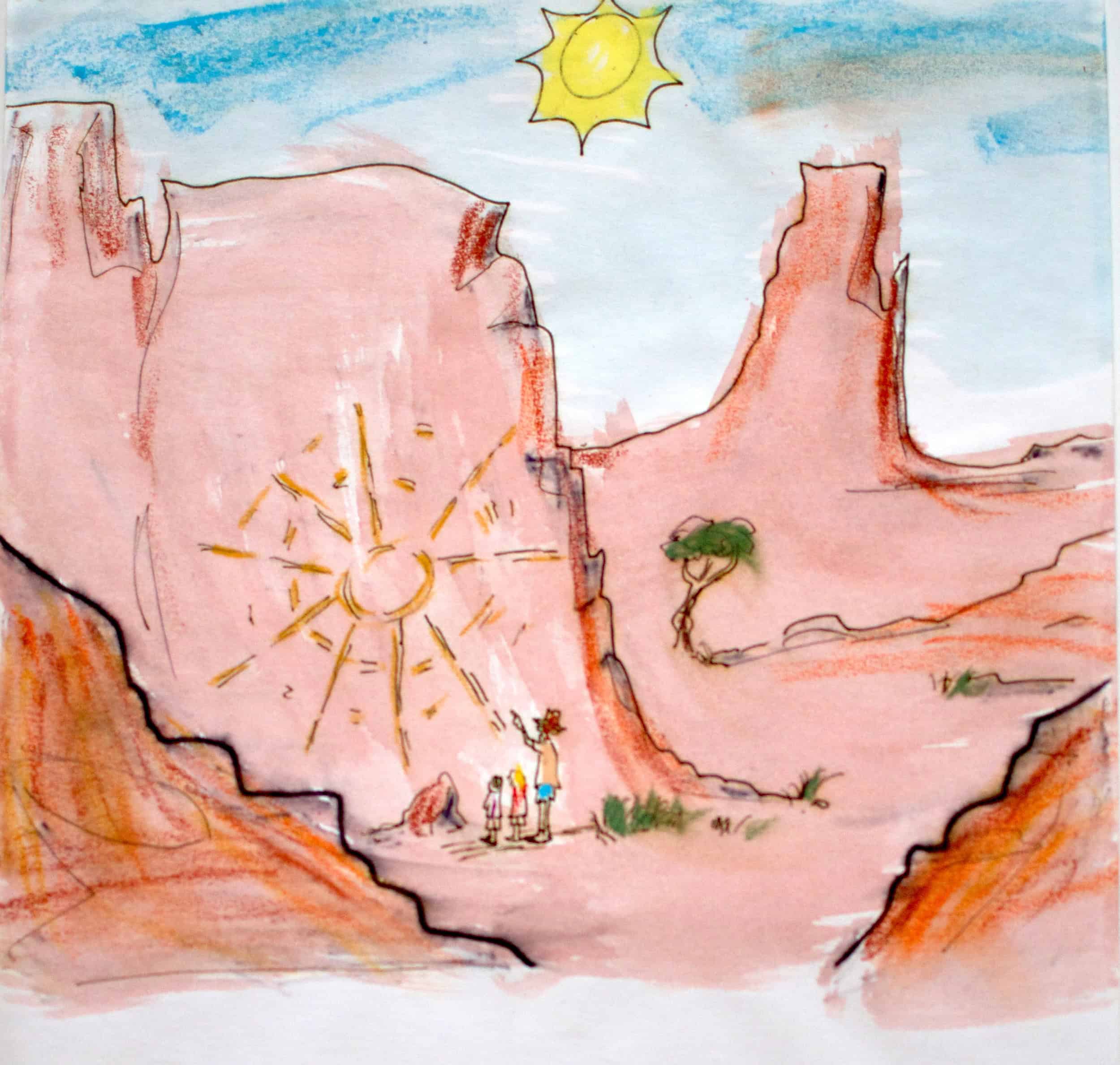 At one point, Uncle Weed made an abrupt turn and headed up a skinny, twisty road. They hiked over some slippery rocks and climbed over a ledge to see a cliff with a sun etched in it. Bob and Otto decided everyone should know where these things are—or at least have an Uncle who does.